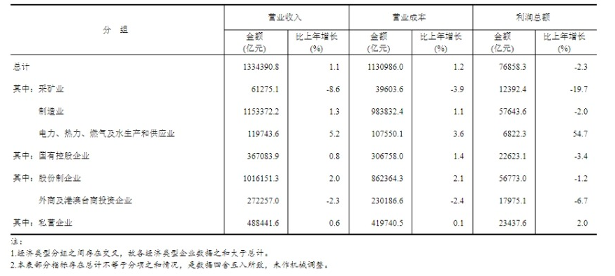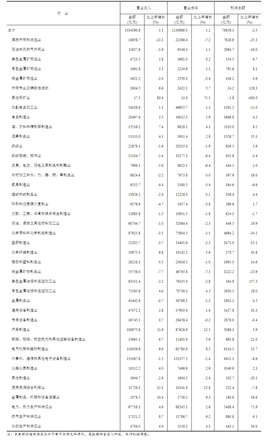 二、规模以上工业企业利润总额、营业收入等指标的增速均按可比口径计算。报告期数据与上年所公布的同指标数据之间有不可比因素,不能直接相比计算增速。其主要原因是:(一)根据统计制度,每年定期对规模以上工业企业调查范围进行调整。每年有部分企业达到规模标准纳入调查范围,也有部分企业因规模变小而退出调查范围,还有新建投产企业、破产、注(吊)销企业等变化。(二)加强统计执法,对统计执法检查中发现的不符合规模以上工业统计要求的企业进行了清理,对相关基数依规进行了修正。(三)加强数据质量管理,剔除跨地区、跨行业重复统计数据。
