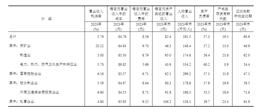 2023年末,规模以上工业企业每百元资产实现的营业收入为82.4元,比上年减少4.9元;人均营业收入为181.5万元,比上年增加5.9万元;产成品存货周转天数为19.3天,比上年增加0.9天;应收账款平均回收期为60.6天,比上年增加4.4天。