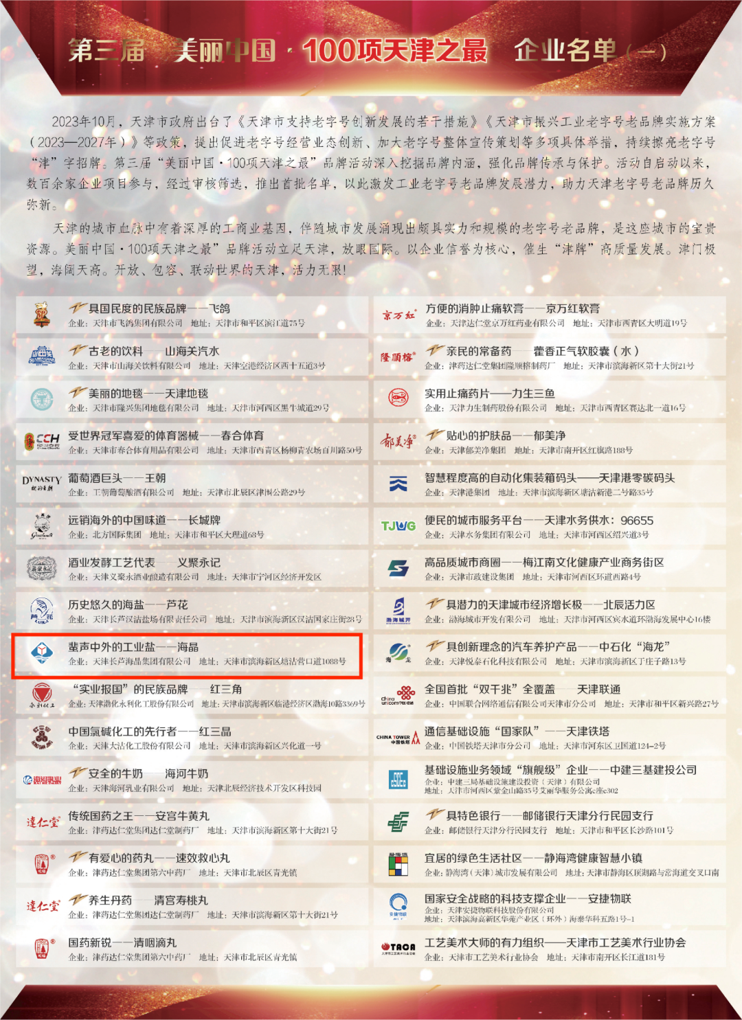 1月30日,《中国企业报》刊登了第三届“美丽中国·100项天津之最”品牌首批名单,公司凭借蜚声中外的工业盐——“海晶”品牌入榜。