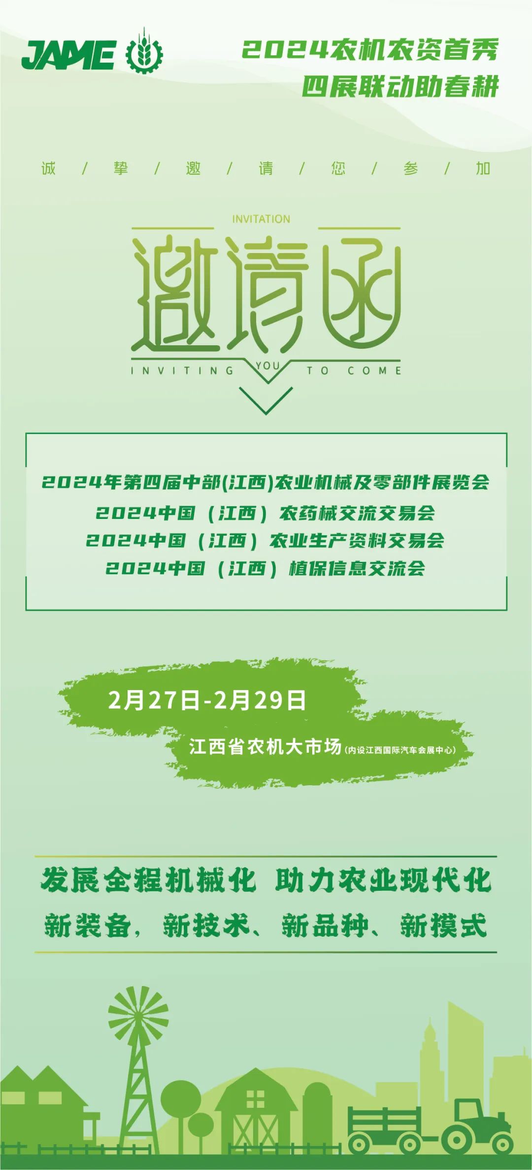 行业盛会享优惠,万众一心备春耕。2024年2月27-29日,2024年第四届中部(江西)农业机械及零部件展览会将在江西省农机大市场(内设江西国际汽车会展中心)举办,同期举办2024中国(江西)农药械交流交易会、2024中国(江西)农业生产资料交易会、2024中国(江西)植保信息交流会。四展融合,精彩齐放,聚焦农业生产资料全产业链,汇聚全国优质农资企业,展示先进农业技术成果,着力打造中部农业盛会。