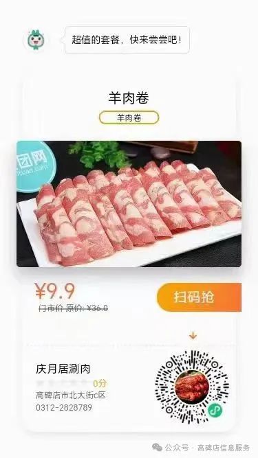 价值36元的羊肉卷,仅售9.9元,每人仅限2份,堂食外卖均可
