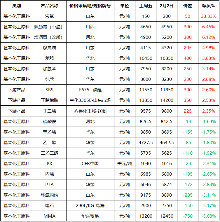 在卓创资讯监测的110个产品之中,本周期有42个产品上涨,占比38.18%;36个产品持稳,占比32.73%;32个产品下降,占比29.09%。上涨的前三名产品为液氯、煤沥青(中温)、煤沥青(改质),涨幅分别为33.33%、6.45%、6.12%;下跌的前三名产品为MMA、电石、环氧丙烷,跌幅分别为5.68%、5.17%、3.11%。