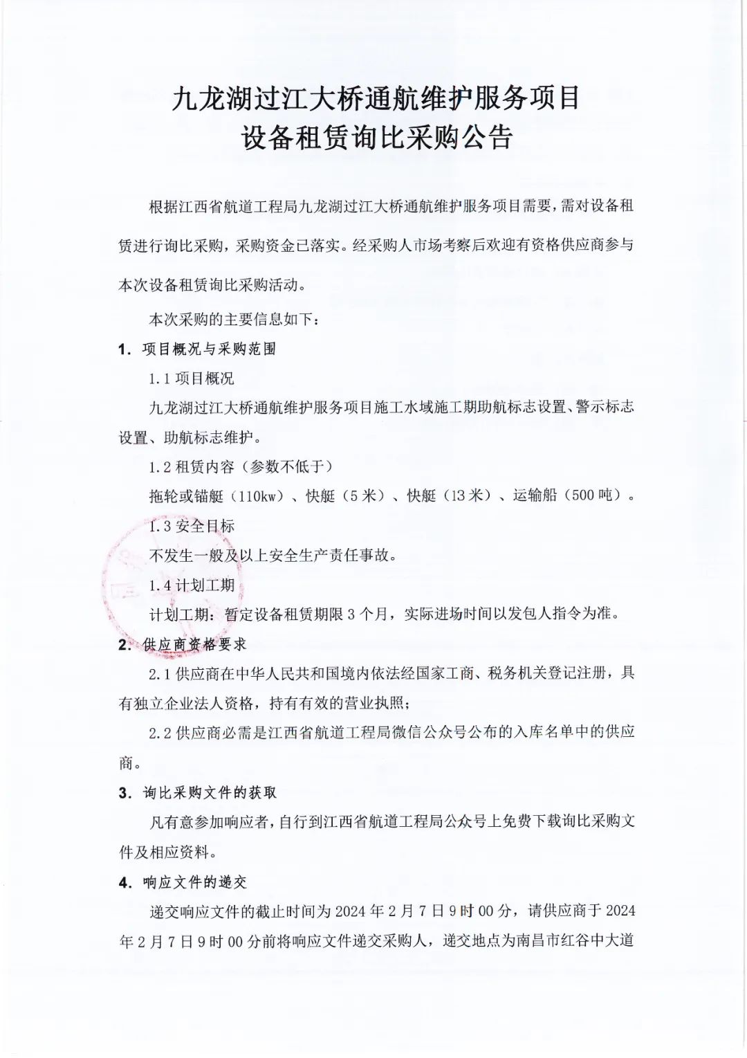 九龙湖过江大桥通航维护服务项目设备租赁询比采购公告