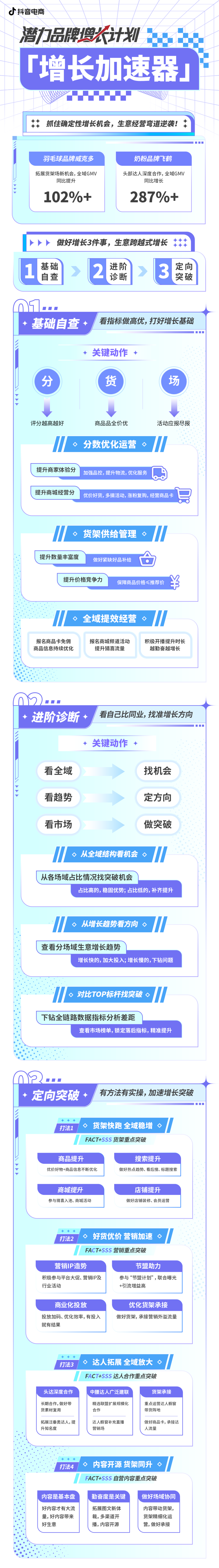 《增长计划》还建议品牌从四个方面进行定向突破:F-自营内容,A&T-达人矩阵,C-营销活动,SSS-搜索、商城、店铺。在刀法看来,“基础自查”更适用于需要夯实基础,短期内看到增长的商家,尤其是初入抖音电商的新玩家,而“进阶诊断”和“定向突破”则适用于基础稳固,但想通过精细化运营寻求进一步增长突破的商家。