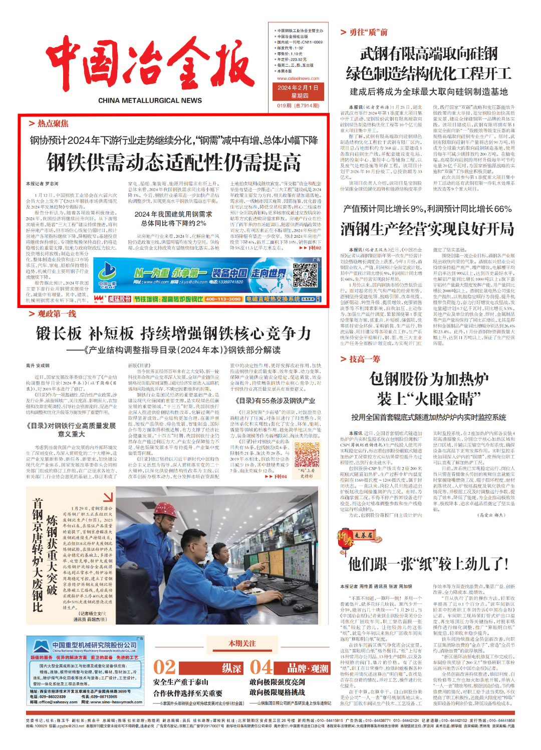 报告据此预计,2024年我国主要下游行业用钢需求继续分化,减量中有增量。其中,建筑、机械用钢需求有所下降,汽车、家电、船舶、集装箱、能源用钢需求有所上升。总体来看,2024年我国钢铁需求同比将小幅下降1%。今后,钢铁行业亟须进一步加快产品结构调整步伐,实现更高水平钢铁供需动态平衡。