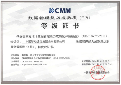 近日,中国电子信息行业联合会发布了《关于公布获得数据管理能力成熟度等级单位的通知》,山东公司成功通过国家标准DCMM(Data management Capability Maturity Model,数据管理能力成熟度评估模型)量化管理级(4级)认证,成为省内通信行业首家获得量化管理级认证的企业。