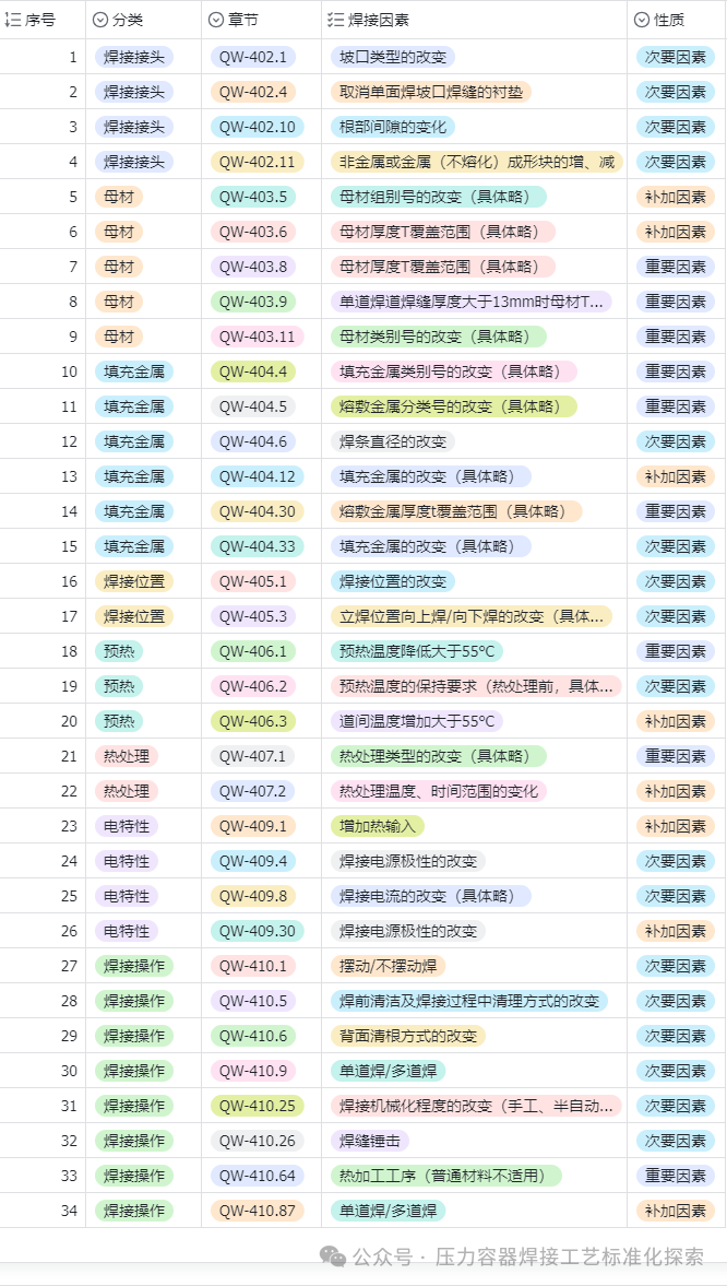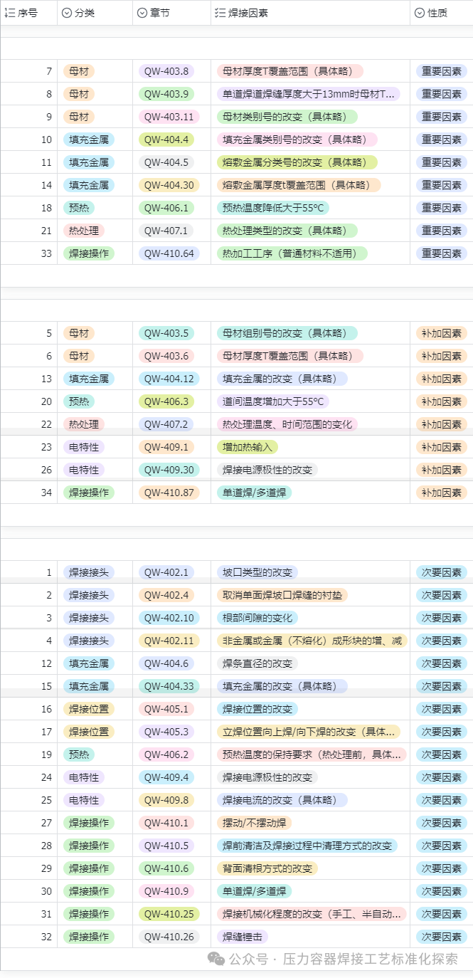 这里要指出的是,对同一焊接方法,焊接接头类型不同时,其对应的因素是不同的。笔者个人理解, 在ASME锅炉与压力容器规范第Ⅸ卷2023版中,焊接接头类型可以分为5种,分别为坡口焊缝与角焊缝、耐蚀堆焊、耐磨堆焊、预边堆焊、换热管与管板焊接,这里先从最常见的接头形式,即坡口焊缝与角焊缝先开始进行讨论。焊材方法则先从焊条电弧焊开始,后续再分析钨极气体保护焊、埋弧焊、熔化极气体保护焊。