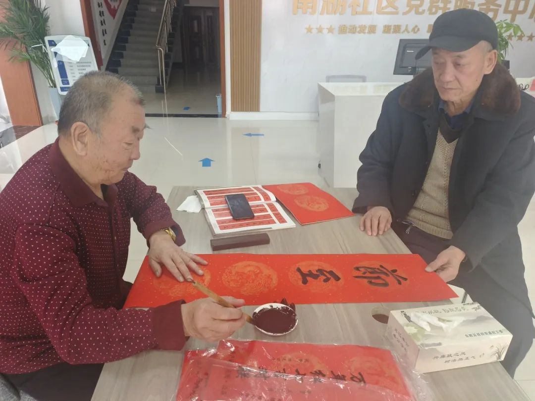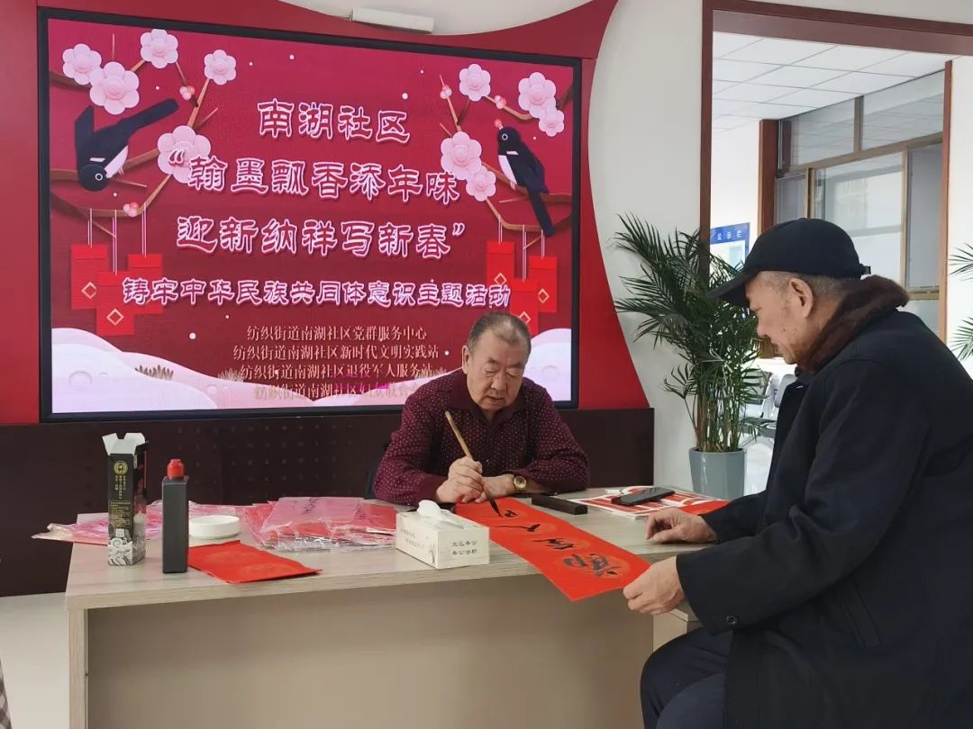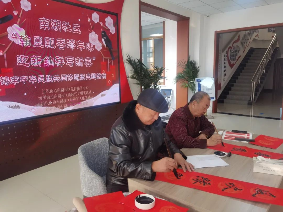 为弘扬中华民族传统文化,丰富辖区居民群众精神文化生活,感受浓厚新春佳节的节日气氛,积极培育邻里和睦、团结友爱的良好社会氛围,2月1日,南湖社区开展“翰墨飘香添年味 迎新纳祥写新春”铸牢中华民族共同体意识主题活动。活动现场居民纷纷挥毫泼墨、凝神动笔,红纸翻飞墨香四溢,一幅幅充满祝福的手写春联呈现在大家面前,大家将散发着墨香的春联进行晾晒,居民挑选心仪的春联满意的拿回家。现场“年味”浓厚热烈,活动共送出30副春联,进一步凝聚了民族团结,铸牢中华民族共同体意识。