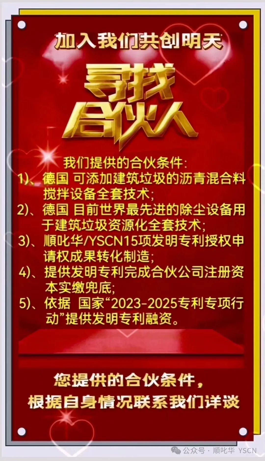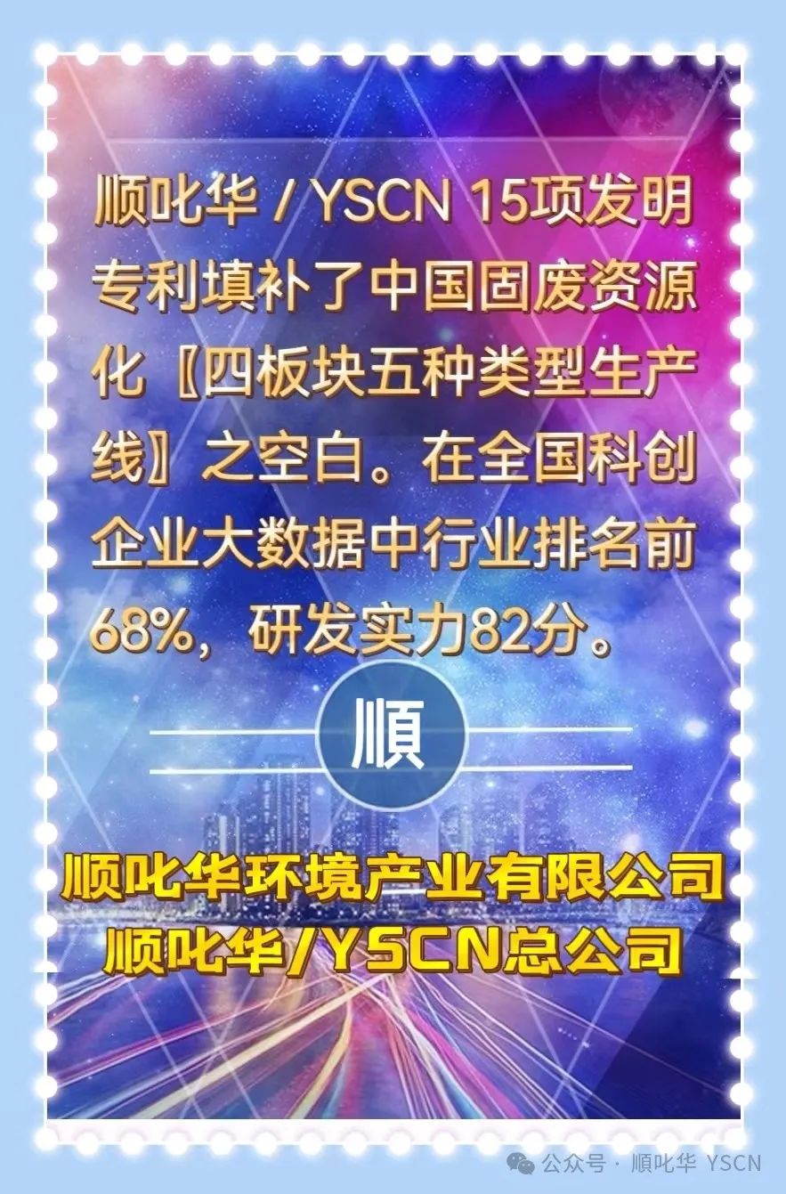 順叱华/YSCN是由15项授权申请权发明专利支撑的产品集成出品商和伴随服务商,该15項发明专利填补了中国固废资源化 “生产线” 空白。