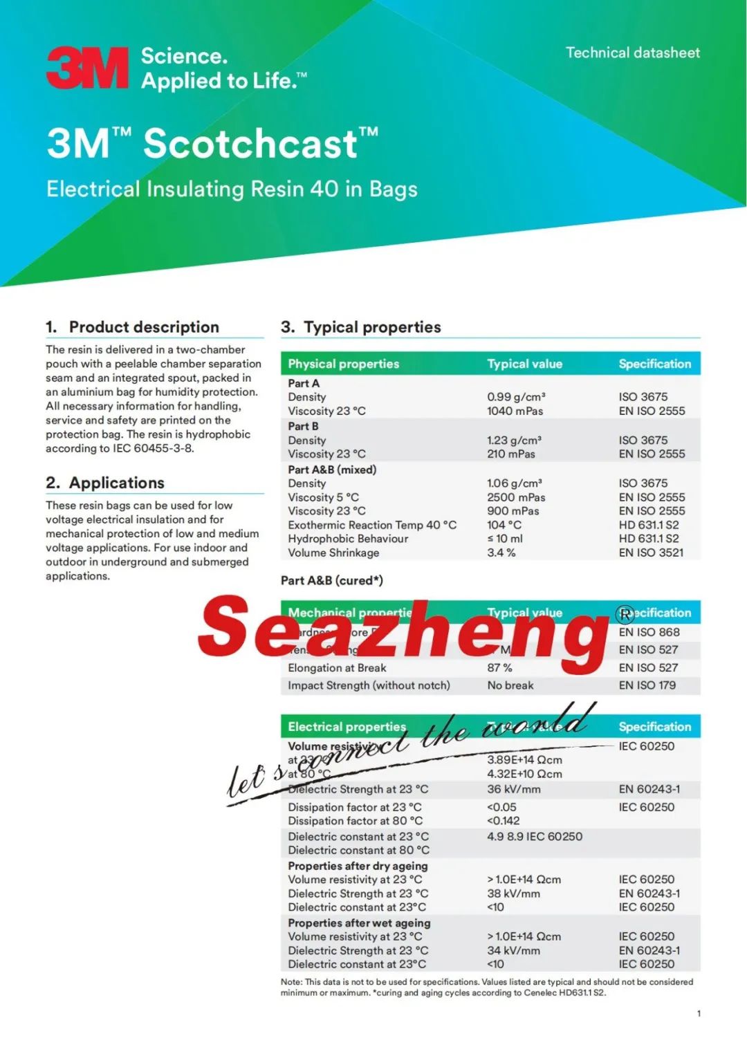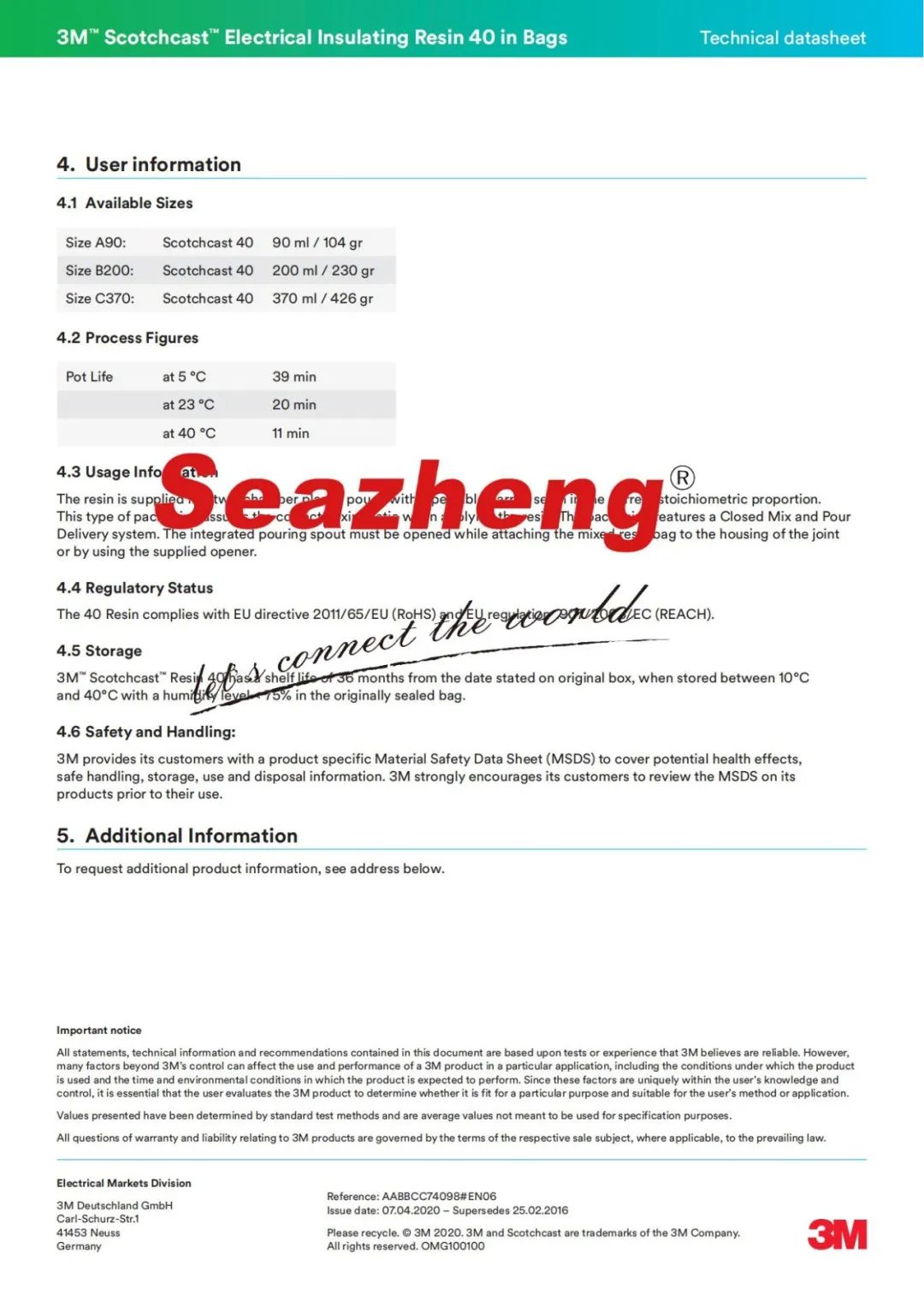 3M 电气树脂40,该树脂被输送在一个双腔室袋中,其中有一个可剥离的腔室分离缝和一个集成的喷口,包装在一个铝袋中以保护湿度。所有有关搬运、服务和安全的必要信息都印在保护袋上。根据IEC 60455-3-8的规定,该树脂具有疏水性。