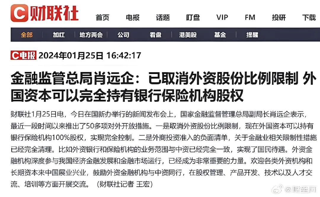 按照字少事大原理,1月25日金融监管总局推出了50多项金融对外开放措施,其中最醒目的一条就是,外国资本可以持有银行保险机构100%的股权,这就意味着今年开始,我们身边会出现越来越多的纯外资银行,保险公司和券商。所以就会出现开头那个问题,咱们把整个事件的脉络捋一捋,可能会对你未来怎么选择机构会有帮助。