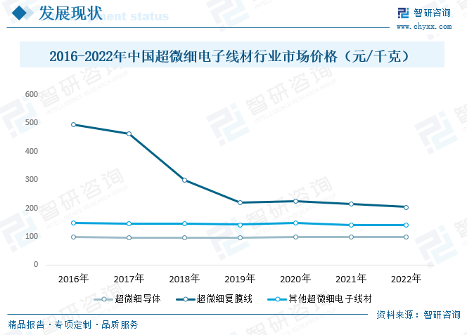 超微细电子线材行业内产品差异较大,主要体现在线径大小与覆膜工艺的不同带来的加工工艺难度的差异,显著的影响了行业内产品价格,同时原材料不同带来的较大的差异也是影响行业价格的重要因素。同时随着我国超微细电子线材技术突破,在高端的复膜线领域的技术不断突破,产品结构逐渐多样化,逐渐实现进口替代,行业市场竞争逐渐加剧,下游需求结构的变化也使得复膜线材需求有所不同,产品需求结构有所变化,复膜线价格呈现出较大幅度的下降,而普通的超微细导体与其他超微细电子线材则保持着较为稳定的价格,但总体呈现出下降趋势。