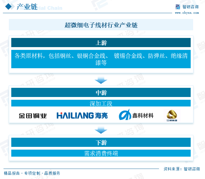 超微细电子线材产品的上游行业是各类原材料,包括铜丝、银铜合金线、 镀锡合金线、防弹丝、绝缘清漆等。第二阶段属于产业链中游,即深加工段。专业技术上主要包括铜材压延加工,企业类型主要是金属加工企业,如精诚铜业、浙江海亮、鑫科材料等。第三阶段属于产业链下游,即需求消费终端。企业类型主要是各行业用户,如海尔、美的、中兴、中船、智慧能源等。
