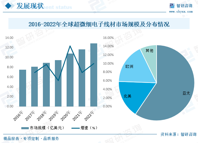 电子产品是全球超微细电子线材主要需求领域,除此之外,新能源汽车、医疗设备等行业的快速发展带动了全球超微细电子线材产业的不断增长,2022年全球超微细电子线材规模达12.85亿美元,同比增长10.02%,2016年到2022年市场规模复合增长率为9.29%。从区域分布来看,亚太、北美和欧洲是全球超微细电子线材主要消费市场。数据显示,2022年亚太地区超微细电子线材规模占比59.41%,欧洲占比17.23%,北美占比16.17%。