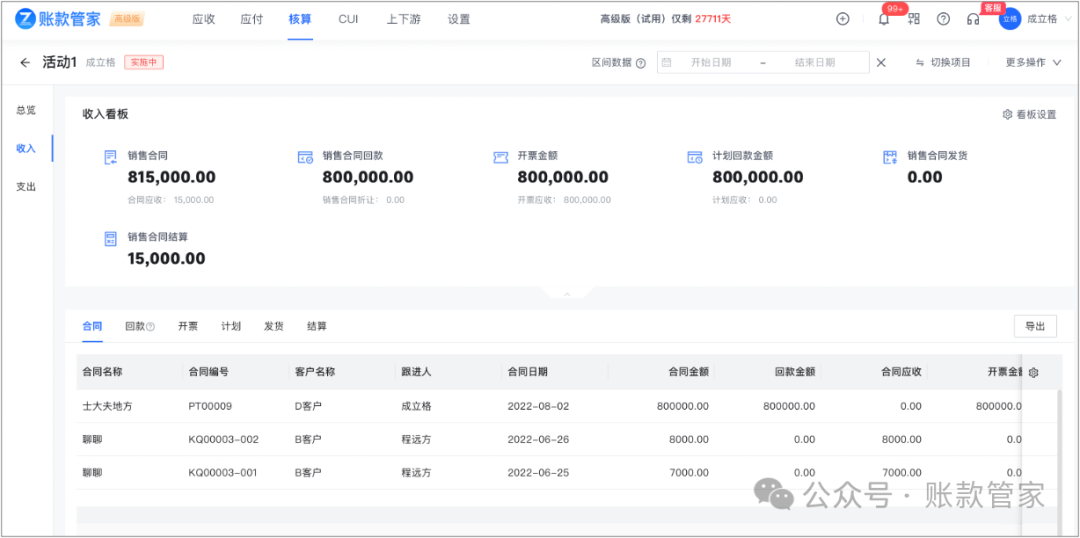 (2)收入板块:收入看板、项目收入所有相关的合同、回款、发票、计划、发货、结算等所有数据列表,并可穿透到原始数据及审批流程。