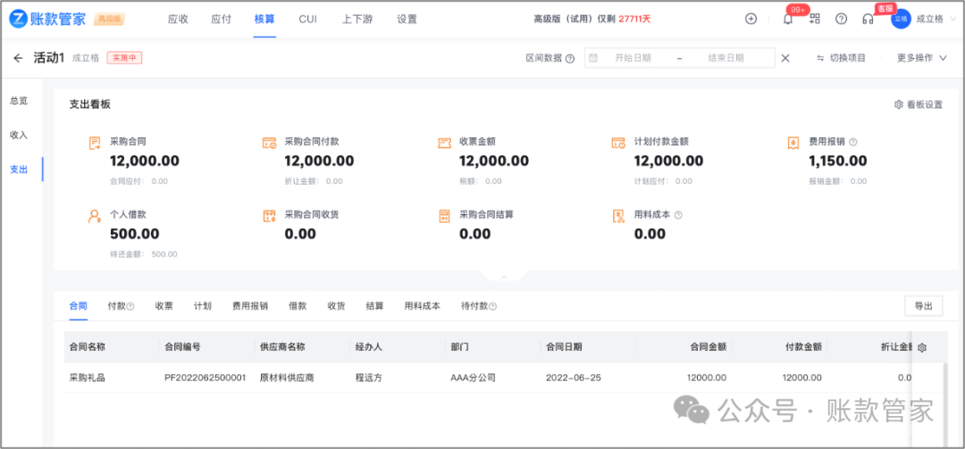 方案:账款管家项目核算一个地方可以查看全面、准确、完整的数据分析,并可以穿透到相关的业务单据、审批流程。
