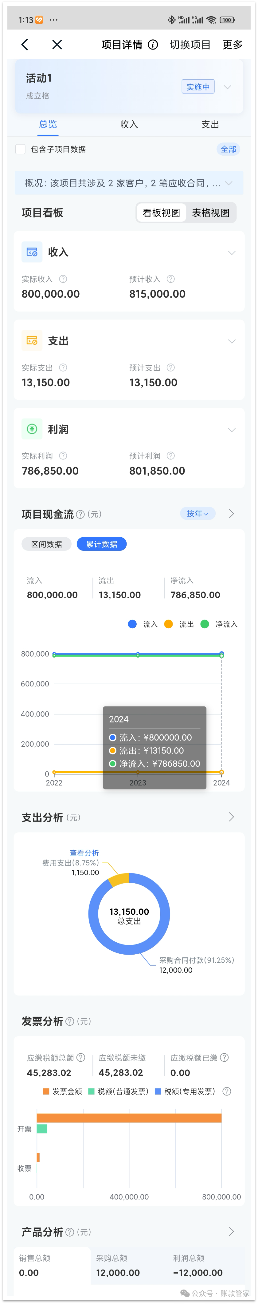(1)项目总览:查看收入、支出、利润、项目现金流、支出分析、发票分析和产品分析等。