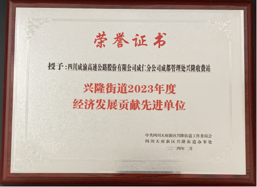 兴隆收费站荣获天府新区兴隆街道“2023年度经济发展贡献先进单位”
