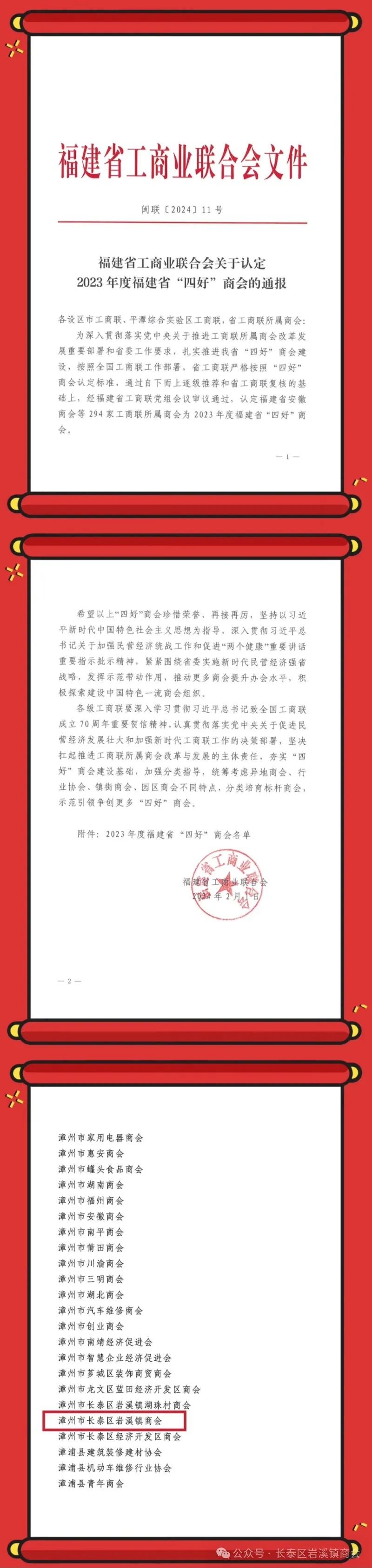 近日,福建省工商业联合会下发《福建省工商业联合会关于认定2023年度福建省“四好”商会的通报》,漳州市长泰区岩溪镇商会荣获福建省“四好”商会。