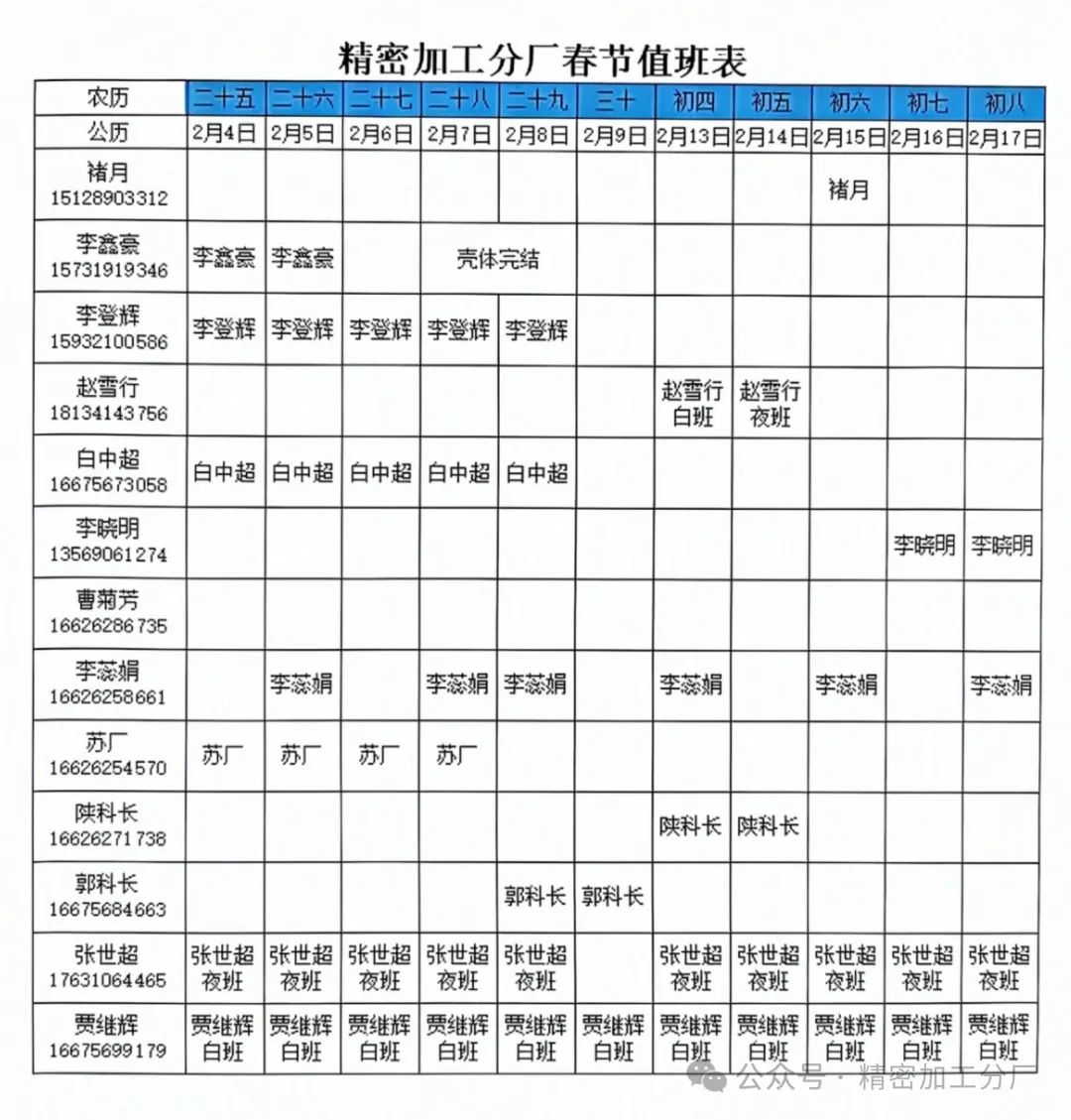 [精密加工分厂春节值班表]