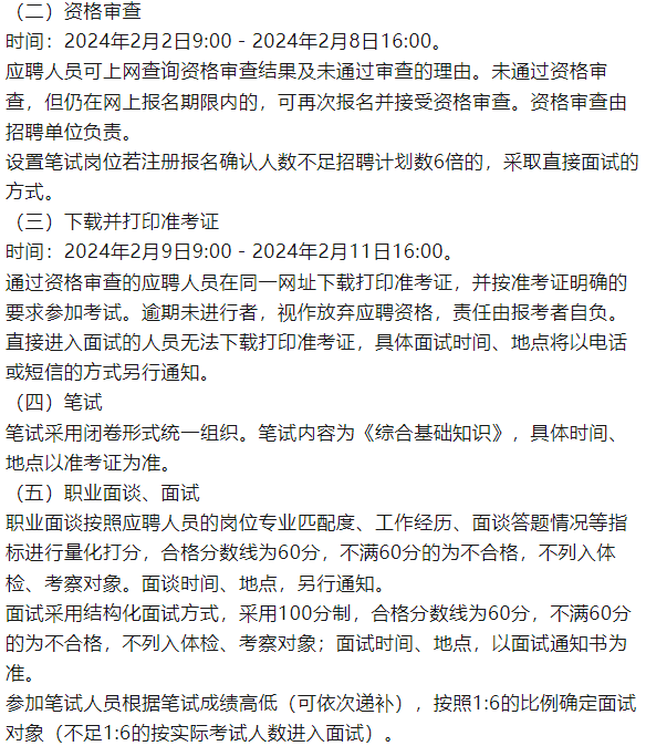 直接面谈/面试岗位以面谈/面试成绩确定总成绩,其余岗位按笔试成绩占40%和面试成绩占60%确定总成绩。依据总成绩按各岗位拟聘用人数1:1的比例从高分到低分确定体检、考察对象。若总成绩相等,以面试成绩高的为先。