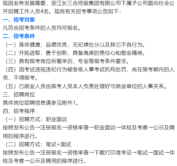 浙江长三合控股集团有限公司下属子公司招聘公告