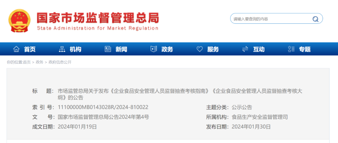 市场监管总局关于发布《企业食品安全管理人员监督抽查考核指南》《企业食品安全管理人员监督抽查考核大纲》的公告为落实《企业落实食品安全主体责任监督管理规定》(市场监管总局令第60号),规范对食品生产经营企业食品安全管理人员监督抽查考核工作,依据《中华人民共和国食品安全法》及其实施条例相关规定,市场监管总局制定《企业食品安全管理人员监督抽查考核指南》《企业食品安全管理人员监督抽查考核大纲》,已经2024年1月8日市场监管总局第2次局务会议通过,现予公告,自2024年3月1日起施行。 市场监管总局