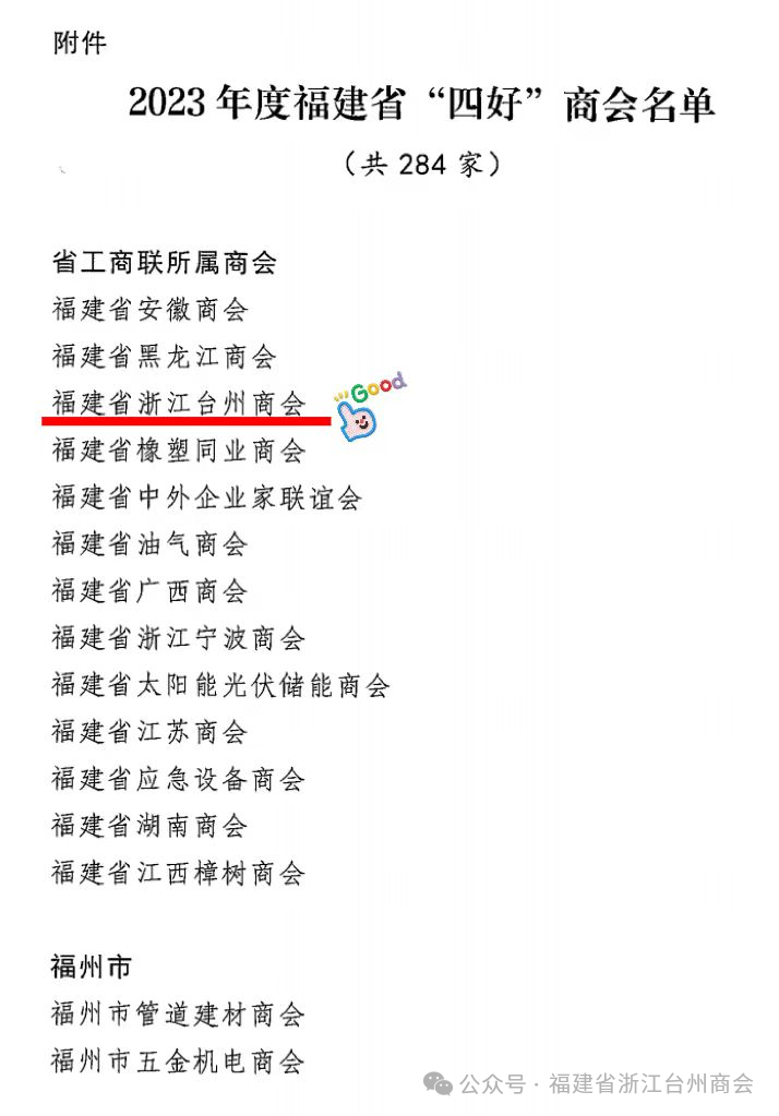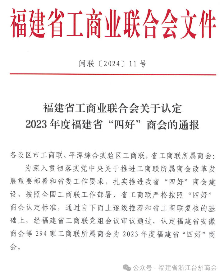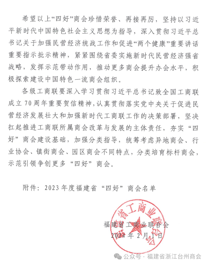 2月2日,福建省工商业联合会发布《福建省工商业联合会关于认定2023年度福建省“四好”商会的通报》(闽联〔2024〕11号),全省284家商会荣获表彰,福建省浙江台州商会荣获2023年度福建省“四好”商会称号。