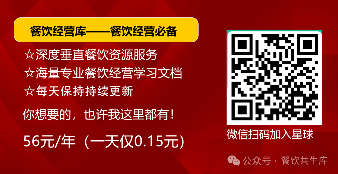 需要下载资料的朋友,可以扫下方二维码付费成为会员,星球目前已经累计收录分享32000+份完整版餐饮资源,随意下载,不受限制!