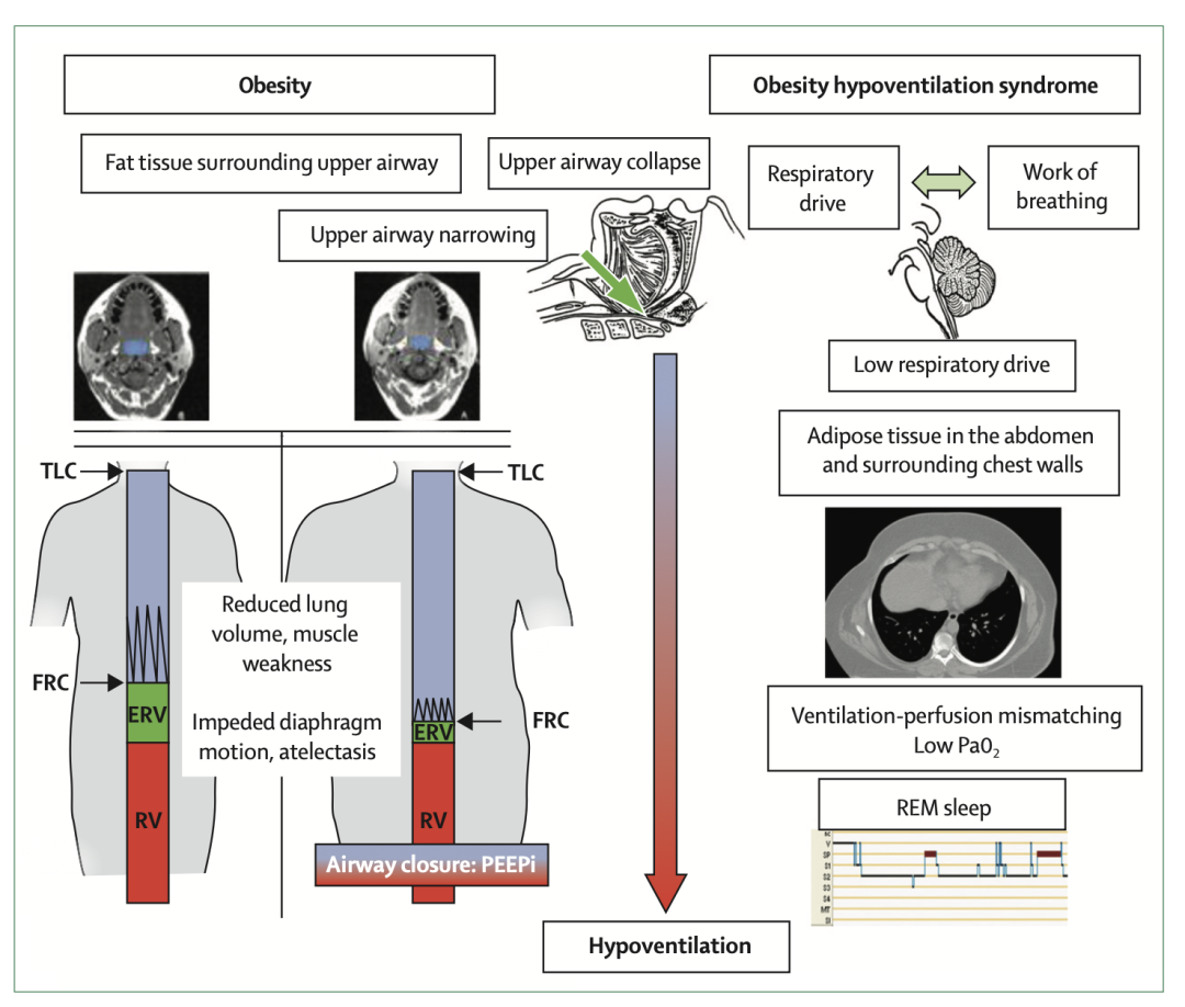 3.肥胖对气道的影响:首先上气道周围脂肪组织数量的增加导致患者在仰卧位时很容易出现上气道的狭窄和闭塞。其次,胸膜腔压力的增高和肺容量的减少会导致呼气末期小气道的闭塞,导致内源性PEEP的产生。气道的狭窄进一步导致呼吸做功的增加。
