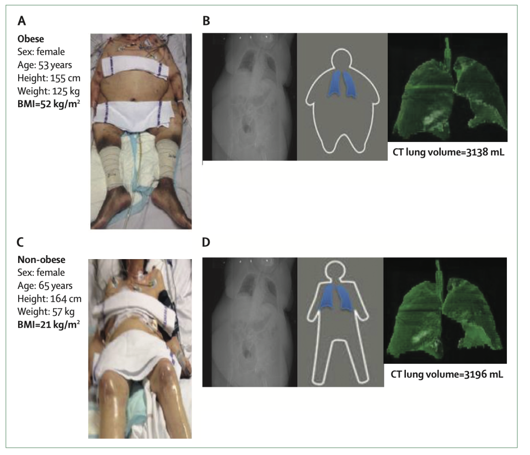 肥胖是一种疾病:体重指数 (BMI)在 25-30 kg/m2 之间称为超重(overweight),BMI超过 30 kg/m2 为肥胖(obesity),BMI超过40 kg/m2 为病理性肥胖(morbid obesity)(图1)。 肥胖患者常常让麻醉医师,重症医师如临大敌,因为肥胖会增加各种操作和治疗的难度。肥胖患者困难气道的发生率是普通患者的 2.5倍;肥胖会增加ICU患者感染的风险,如呼吸机相关性肺炎和导管相关性血流感染;增加医源性不良事件的风险,如导管相关性气胸、褥疮和血栓栓塞性疾病。肥胖是一种全身性的疾病,与正常体重患者相比,肥胖患者的ICU住院时间和住院费用显著的增加(图2)。