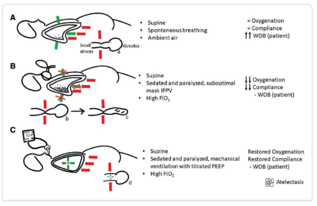 氧和目标:肥胖患者肺不张发生的风险较高,高浓度氧疗会增加肺不张发生的风险,氧分压过高会导致脱机后高碳酸血症的恶化,相关机制可以参考(COPD的机械通气策略)。因此在急性期把氧分压维持在正常的低值80-90mmHg是合理的。