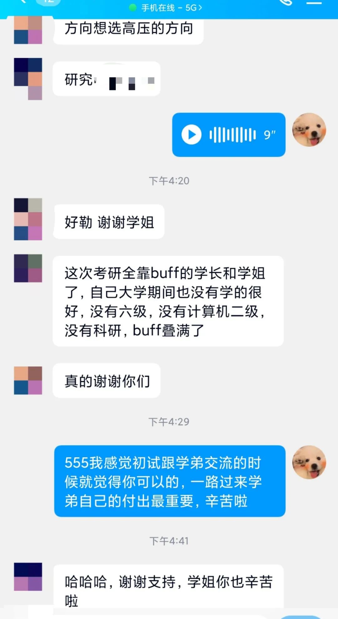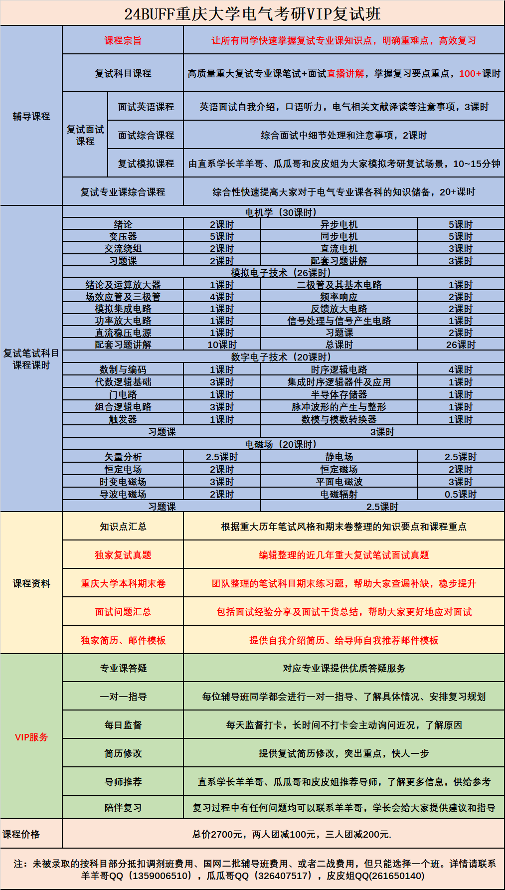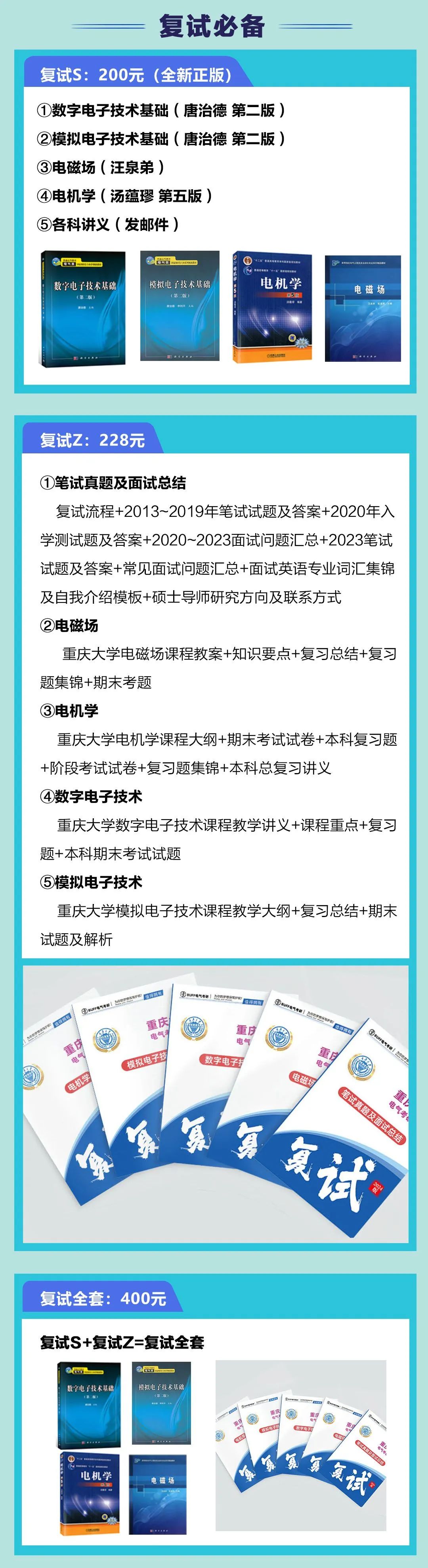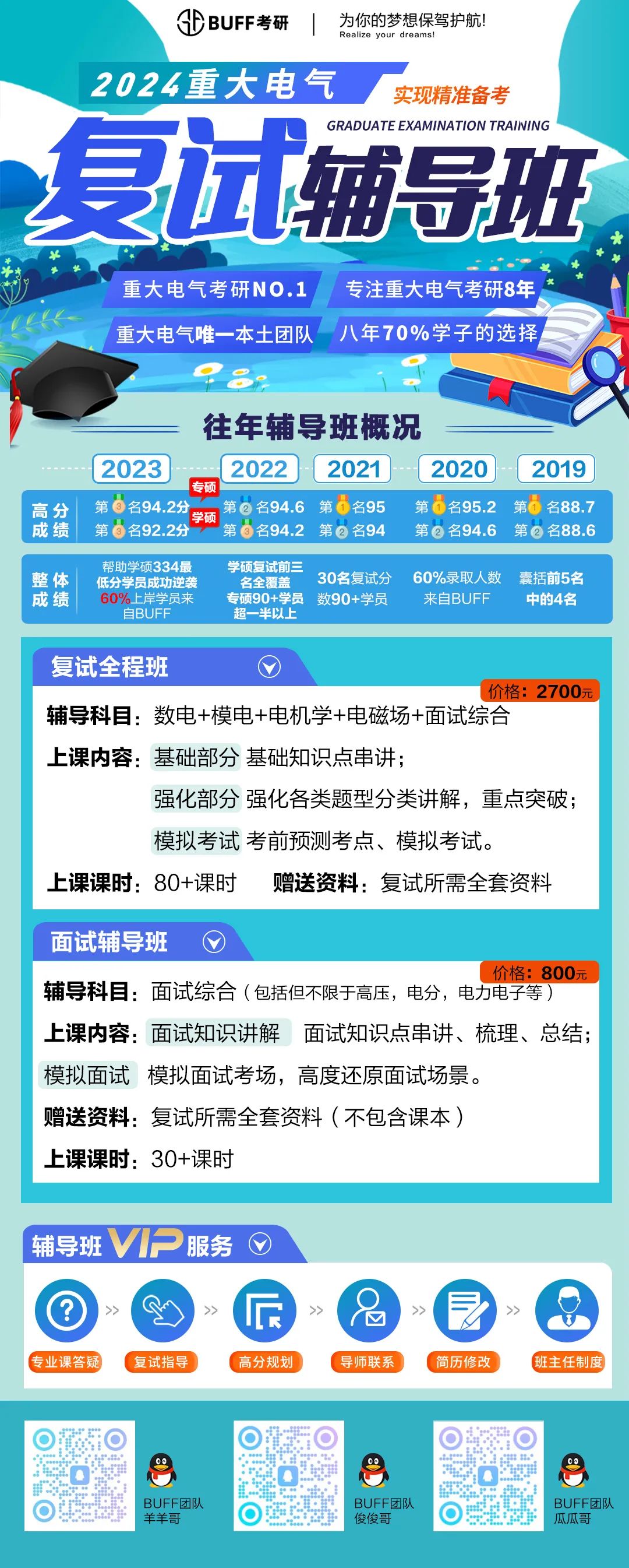 复试心得:学姐认为比较全面的复习大概分为3个阶段:1)笔试科目基础阶段:花一个月左右的时间结合笔试基础课程浏览课本,课前先对老师发的提纲对课本进行预习,对基础知识有个大概的了解,做布置的课后习题巩固加强。2)笔试科目强化阶段:花一个月左右刷资料中的期末考试卷和往年真题。期末考试卷会出现50%左右的原题,除了适当的记忆,更多的是需要理解原理和具备基本的分析能力。3)笔试科目巩固+面试科目学习:最后一个月左右的时间,笔试科目回顾基础知识加上二刷做过的错题,同时开始面试科目的复习;由于重大面试科目没有说明一定会考哪几门科目,还是首先以课程会开设的高电压、电力系统以及电力电子这三门为主,其他科目就可以看下面试那本资料上的问答题;此间还需要开始英语的背诵,包括一些自我介绍、本科院校介绍等等。笔试差别很大,拿及格比较容易,拿高分需要水平。往年有出现很多高分的被刷,也有很多低分的逆袭,比如2019年笔试难度提高了一些,专硕有不少初试400+的笔试不及格被刷,但是一位初试354分(排名200+)的学弟,复试笔试进入前五,面试也很高,最终排名27顺利录取,并且喜提奖学金,通过复试超越了200位对手,成功逆袭。2023年同样很多本科学校好,初试分数高的同学不重视复试,最终因为笔试不及格被刷,尤其是笔试采用赋分制之后,大家更加不能掉以轻心,大家一定要引起重视。2024年大概率还是采取线下的方式,但可能不再采用赋分制。占比50%的复试大家一定要充分准备。