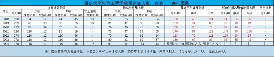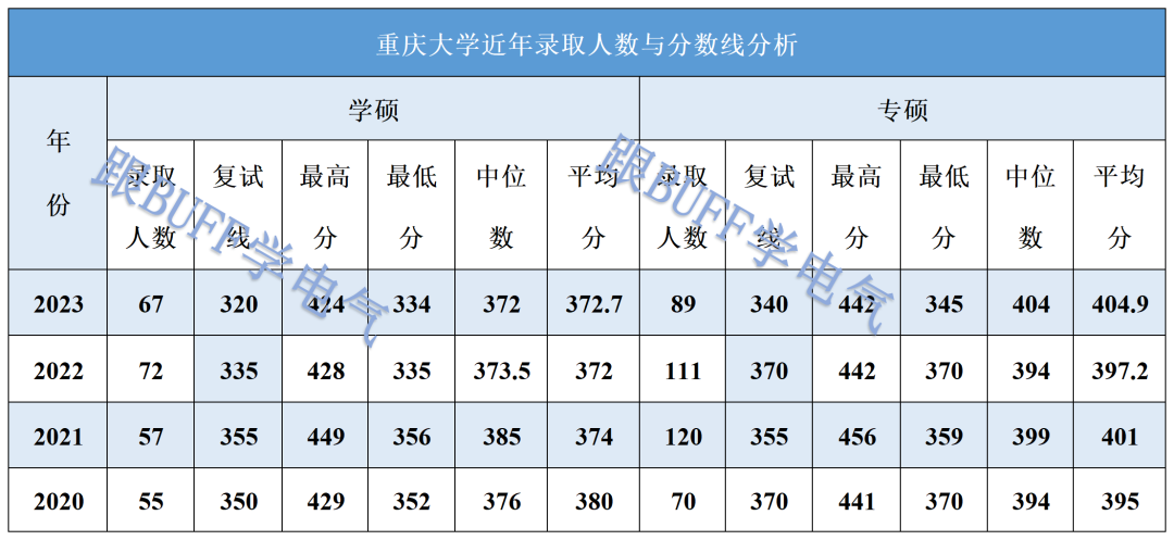 2023年重庆大学电气学硕参加复试122人,录取67人,复录比1.9:1,复试线320分,录取最低分334分,最高分424分,平均分372.7分,390分以上全部录取,复试线相较于2022年降低15分。专硕参加复试279人,录取84人,复录比3.32:1,复试线340分,录取最低分345分,最高分442分,平均分404.9分,复试线相较于2022年降低30分。后续又进行了补充录取,补录了五名考生,所以专硕最终招生人数为89人。重庆大学电气实力强劲,尽管学硕23年的复试线较22年降低15分,专硕降低30分,但是录取的平均分变化不大,学硕录取平均分近年都在370+,专硕平均分更是在400分左右,竞争更大。从招生人数上来看,重庆大学特殊计划不占据统考名额。而且几乎每年实际招收的统考名额都远远大于考试前公布的统招名额,很大一部分原因是总名额中的大部分指标都给了保研,但是每年保研人数都没达到指标数,剩下的名额就顺到了统招名额。所以看到官网公布的名额不要轻易退缩,看每年实际录取人数才具备参考性!一、复试内容