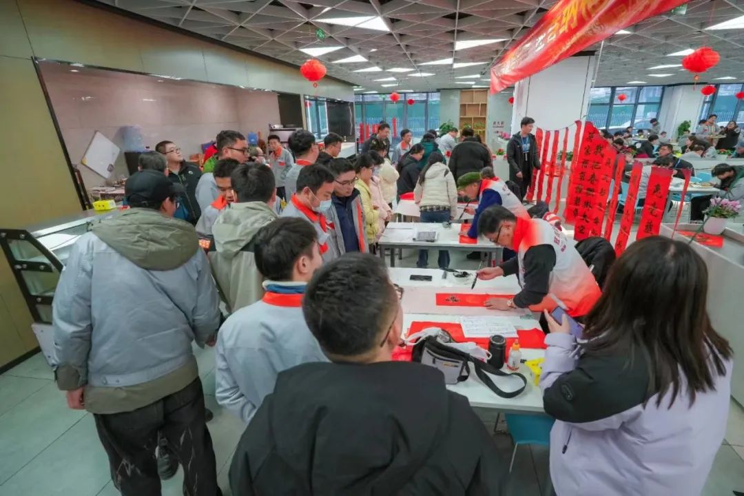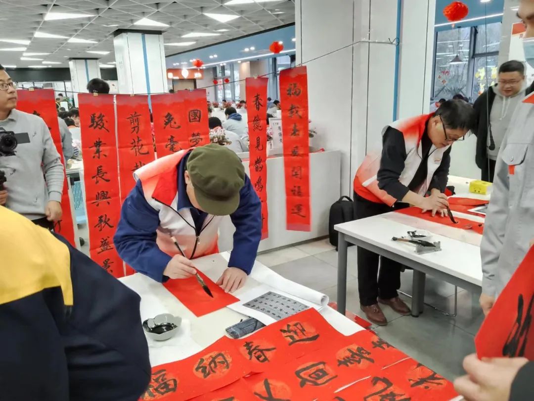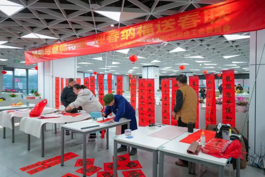 中午时分,奧特维公司工作人员就在员工食堂中心位置悬挂了由新吴分会老师们精心创作书写的春联及布置好了书写台案,使整个员工食堂充满了浓浓的春节氛围。