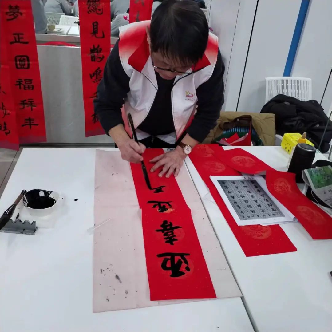 两位老师一到书写现场就立即铺纸蘸墨书写福字,短短十余分钟近40张福字已铺满地上。当准点前来就餐的员工到达,立即排队求写春联。这些在异地他乡工作的游子,都想带一付无锡春联回老家,张贴在大门上,给家人一个喜悦。