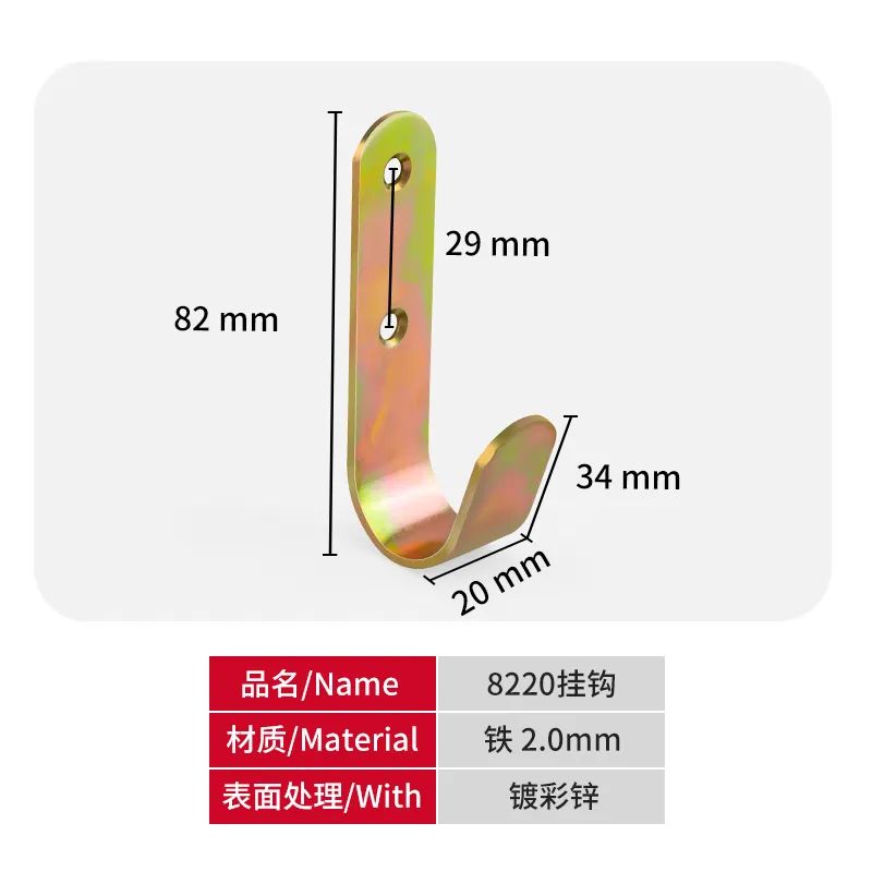 【 挂钩系列 】之名 称:镀彩锌挂钩型 号:82x20材 质:铁表面处理:镀彩锌规 格:长度82.0mmx宽度20.0mm x厚度2.0mm包装规格:1000只/件(袋装)说 明:说明:点击→长按图片可发送或保存图片。