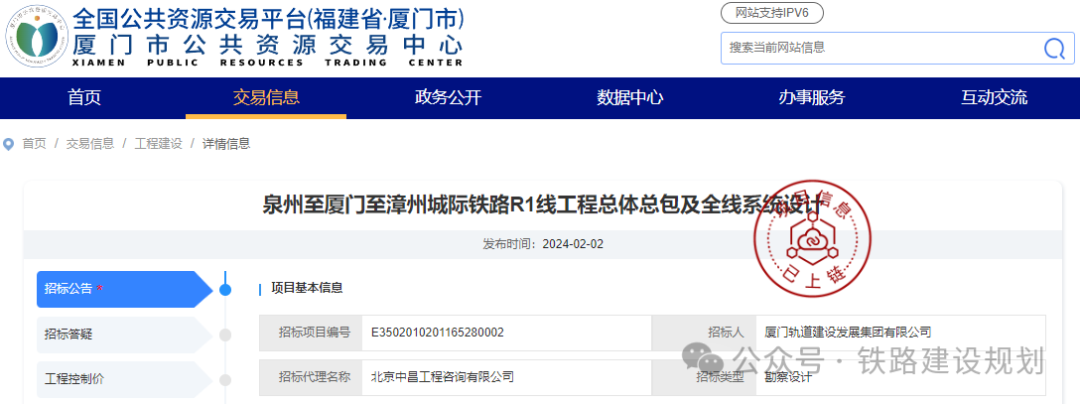 2月2日,厦门市公共资源交易网发布《厦漳泉城际铁路R1线工程总体总包及全线系统设计招标公告》,项目投资总额727亿元。