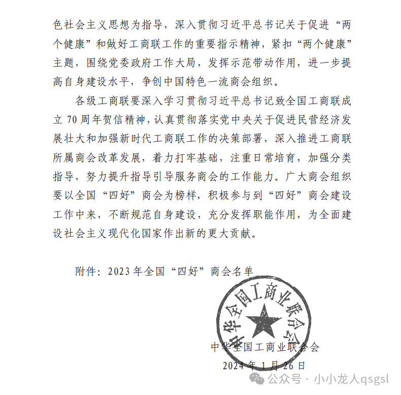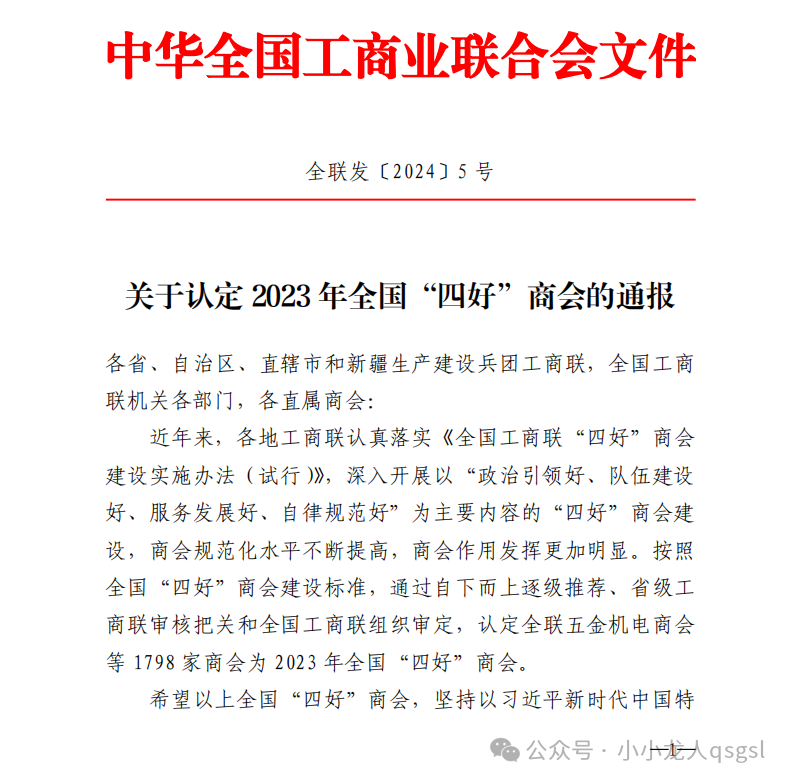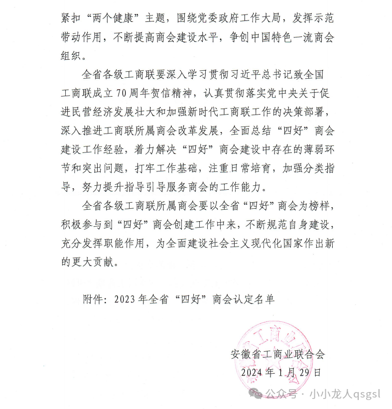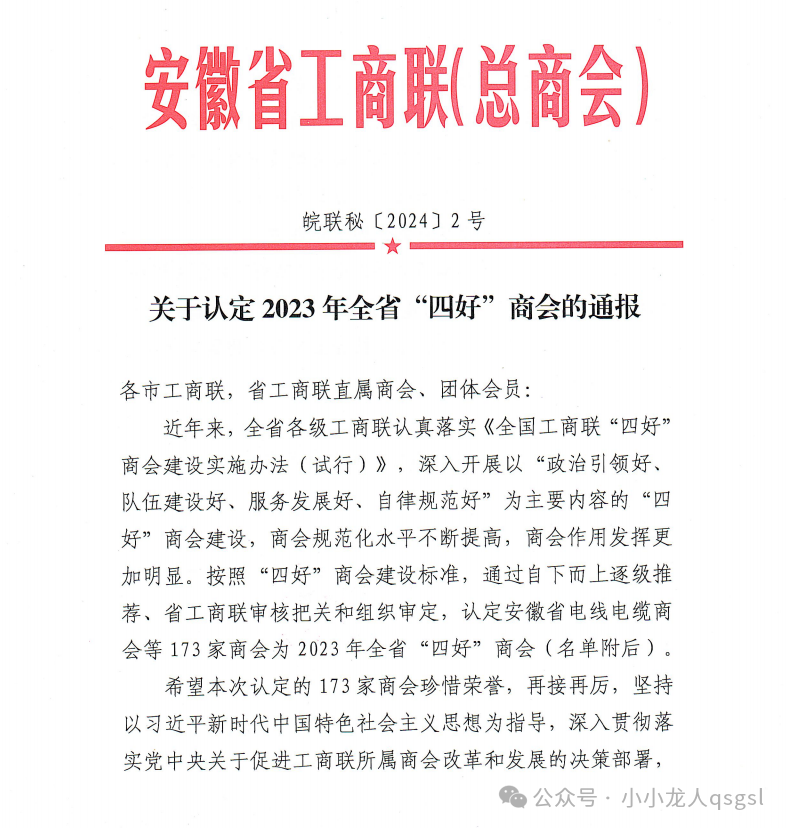 1月26日,中华全国工商业联合会印发《关于认定2023年全国“四好”商会的通报》,合肥市潜山商会又一次被认定为2023年全国“四好”商会。