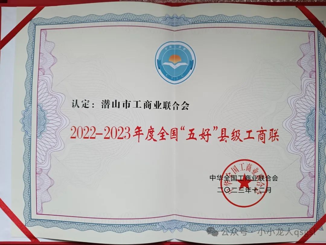 1月9日,中华全国工商业联合会下发《关于认定 2022-2023 年度全国“五好”县级工商联的通报》,潜山市工商业联合会再次被认定为2022-2023年度全国“五好”县级工商联。