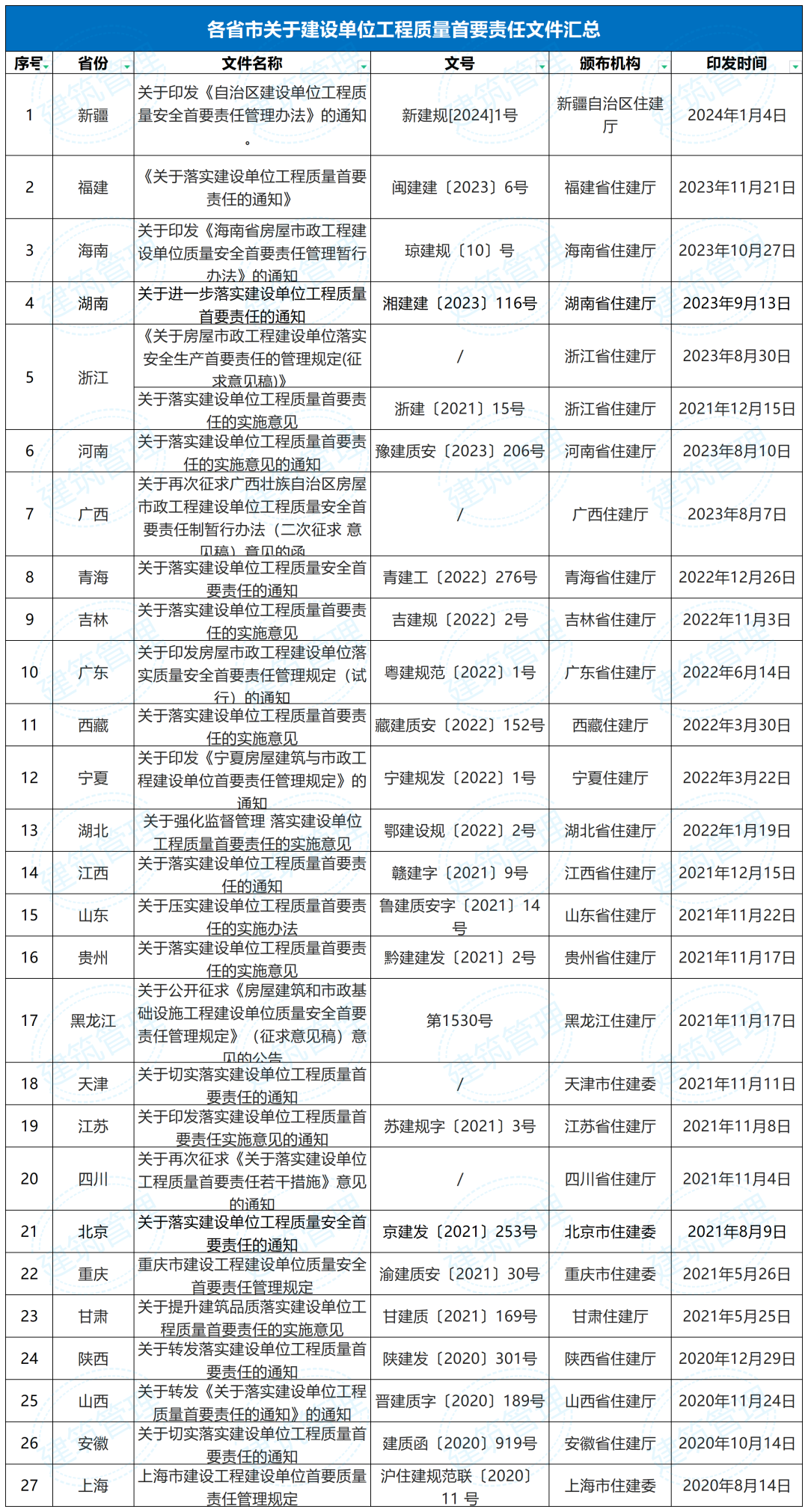 截至目前,27省市发文跟进住建部《关于落实建设单位工程质量首要责任的通知》(建质规〔2020〕9号),严格落实建设单位工程质量首要责任。