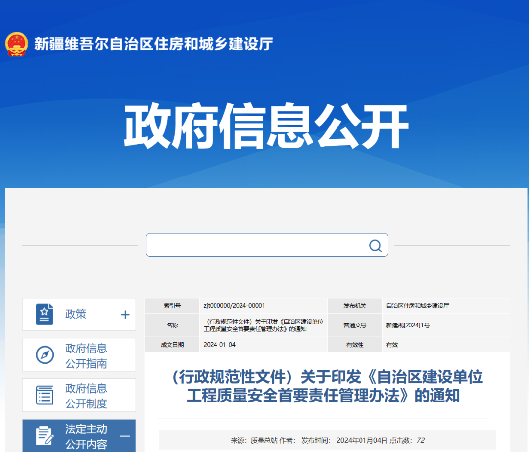 1月4日,新疆自治区住建厅印发《自治区建设单位工程质量安全首要责任管理办法》的通知。自2024年2月15日起施行,有效期5年。