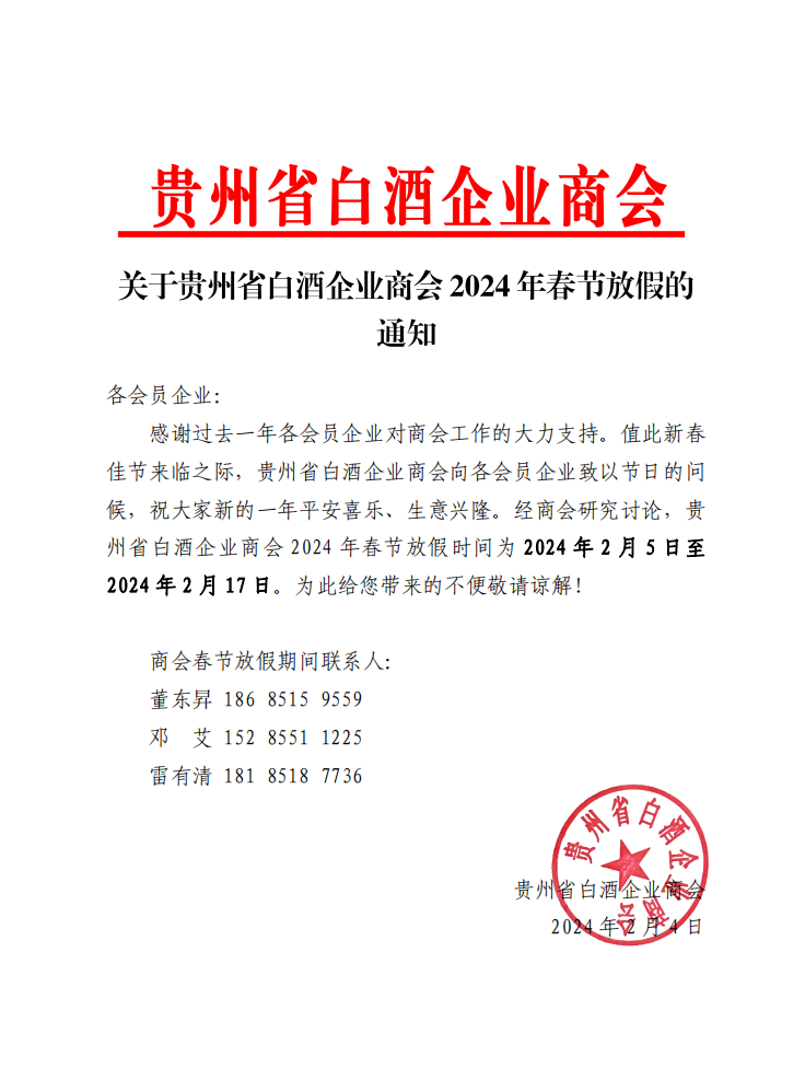 关于贵州省白酒企业商会2024年春节放假的通知