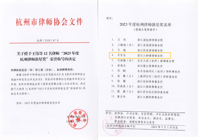 为树立典型、表彰先进,激发全市广大青年律师的积极性、创造性,充分发挥青年律师在律师行业发展中的推动作用,杭州市律师协会开展了“2023年度杭州律师新星奖”评选活动。2024年2月1日,经评审会议评选,浙江省陕西商会副会长、六和所高级合伙人牛宇龙荣获“2023年度杭州律师新星奖”荣誉称号。
