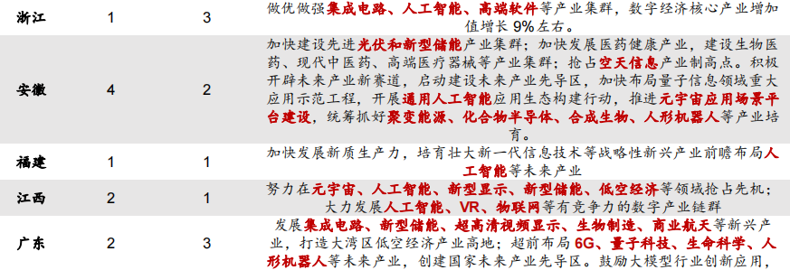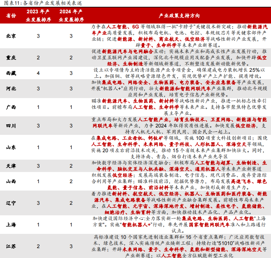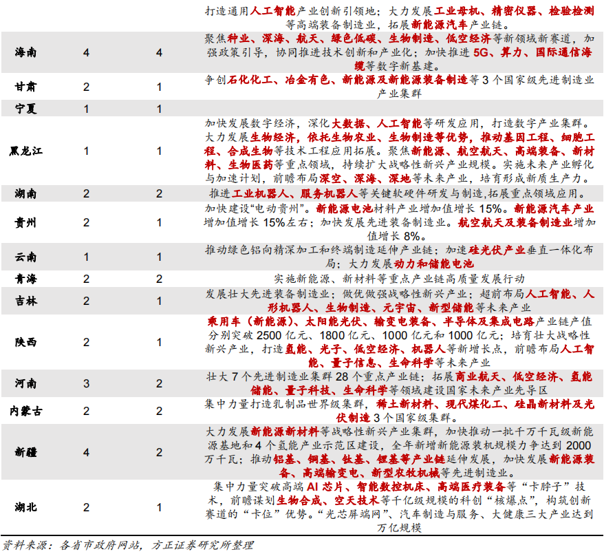 各省在现代化产业体系战略产业政策方面的主要描述主要围绕两个方面,一是强链补链下国家先进制造业产业集群的发展完善,二是围绕高水平科技自立自强下的未来产业布局规划。从新能源领域具体涉及的方向来看,新能源相关行业产业集群的发展完善仍旧是2024年各省产业发展的重点方向,包括新能源汽车、绿色能源和新型储能等。