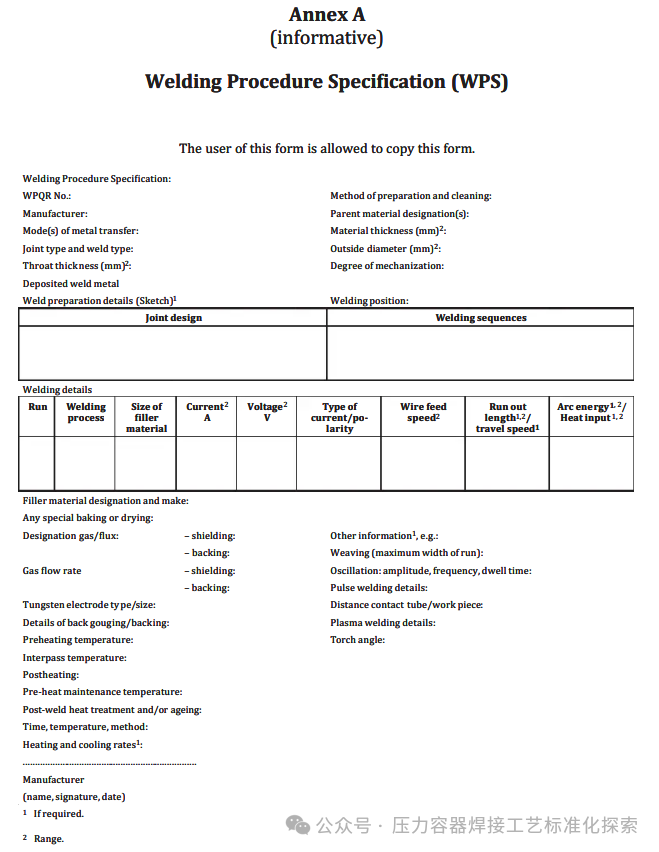 在国际标准ISO 15609-1 Second Edition 2019-08《Specificaton and qualifiction of welding procedurs for metallic materials—welding procedure speification—Part 1: Arc Welding》中,对焊接工艺规程(WPS)应包括的内容有非常详细、具体的要求,还给出了参考的样表(图4)。