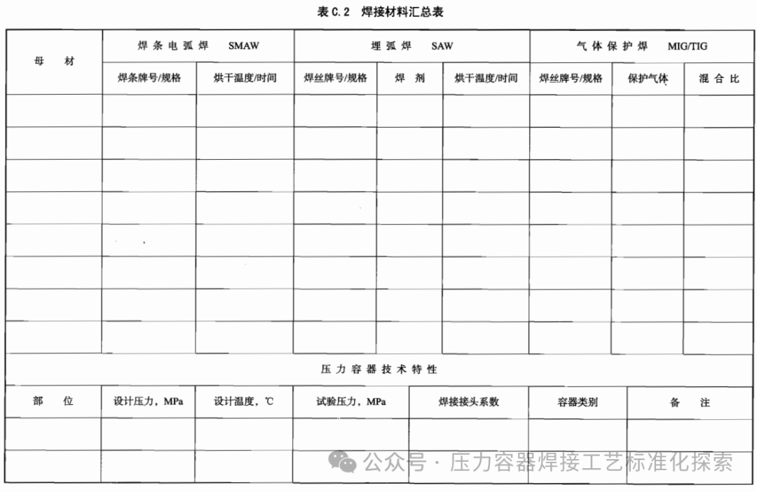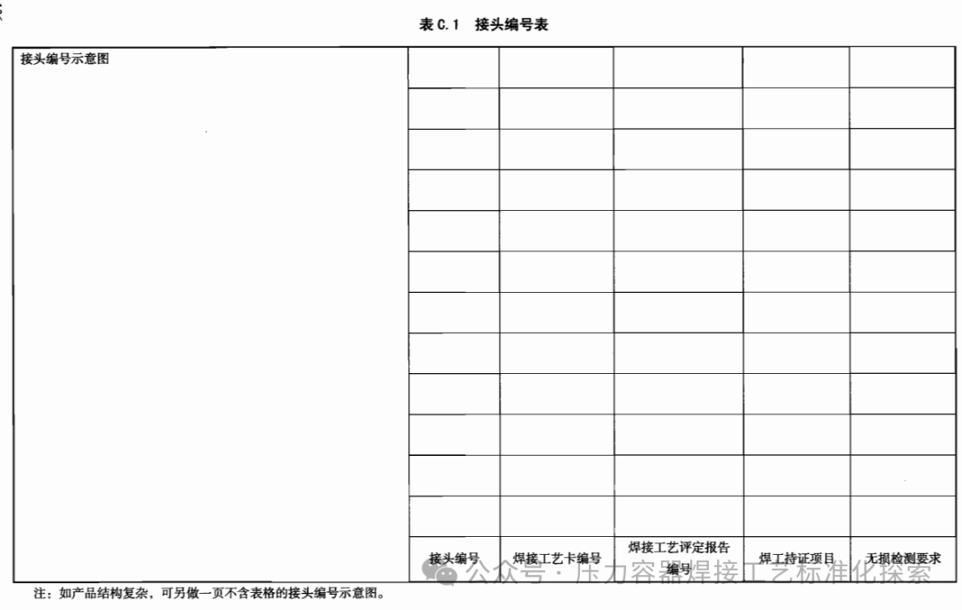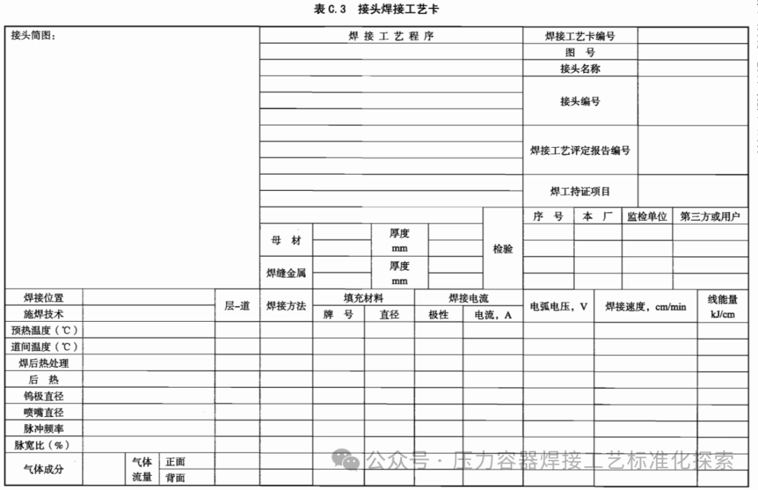 附录C中的焊接工艺文件其实是包括了JIC卡(焊缝识别卡 Joint Identification Card,图1)、焊材汇总表(图2)、焊接接头工艺卡(可以理解为WPS,图3)的针对压力容器设备编制的一套焊接工艺文件(包括但不限于WPS)。