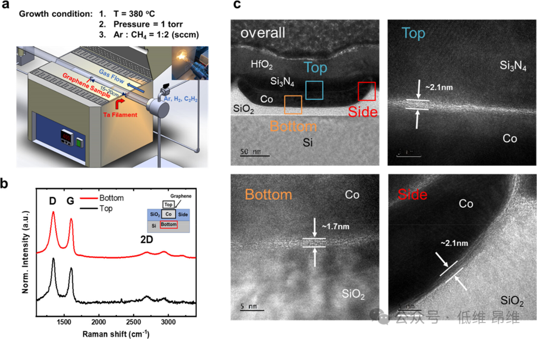图1. (a)HW-CVD工艺装置的示意图。(b)GAA结构中石墨烯的拉曼光谱。(c)在单个大马士革Co互连中,顶部、底部和侧面结构周围的石墨烯HRTEM图像。