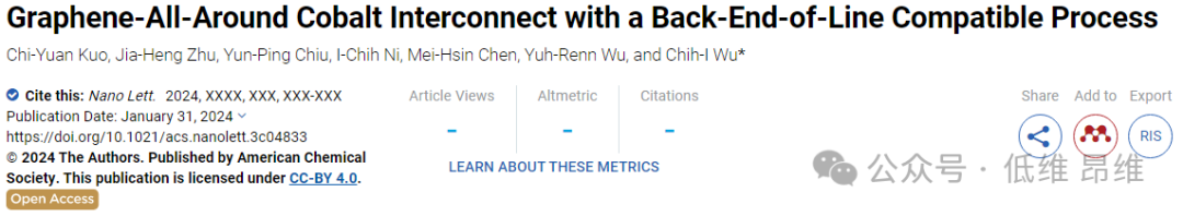 近日,国立台湾大学Chih-I Wu等证实了石墨烯全环绕(GAA)结构可以在380 ℃下使用热线化学气相沉积直接生长,在后端线(BEOL)的热预算范围内。与GAA结构的钴(Co)互连表明,电流密度增加了10.8%,电阻降低了27%,电迁移寿命延长了36倍。X射线光电子能谱和密度泛函理论计算表明碳和Co之间存在键合,这使得Co原子更稳定地抵抗外力。石墨烯在GAA结构中作为扩散势垒的能力通过随时间的介电击穿测量得到证实。GAA结构内的Co互连具有增强的电学性能和可靠性,表明了作为下一代CMOS BEOL互连材料的兼容性应用。