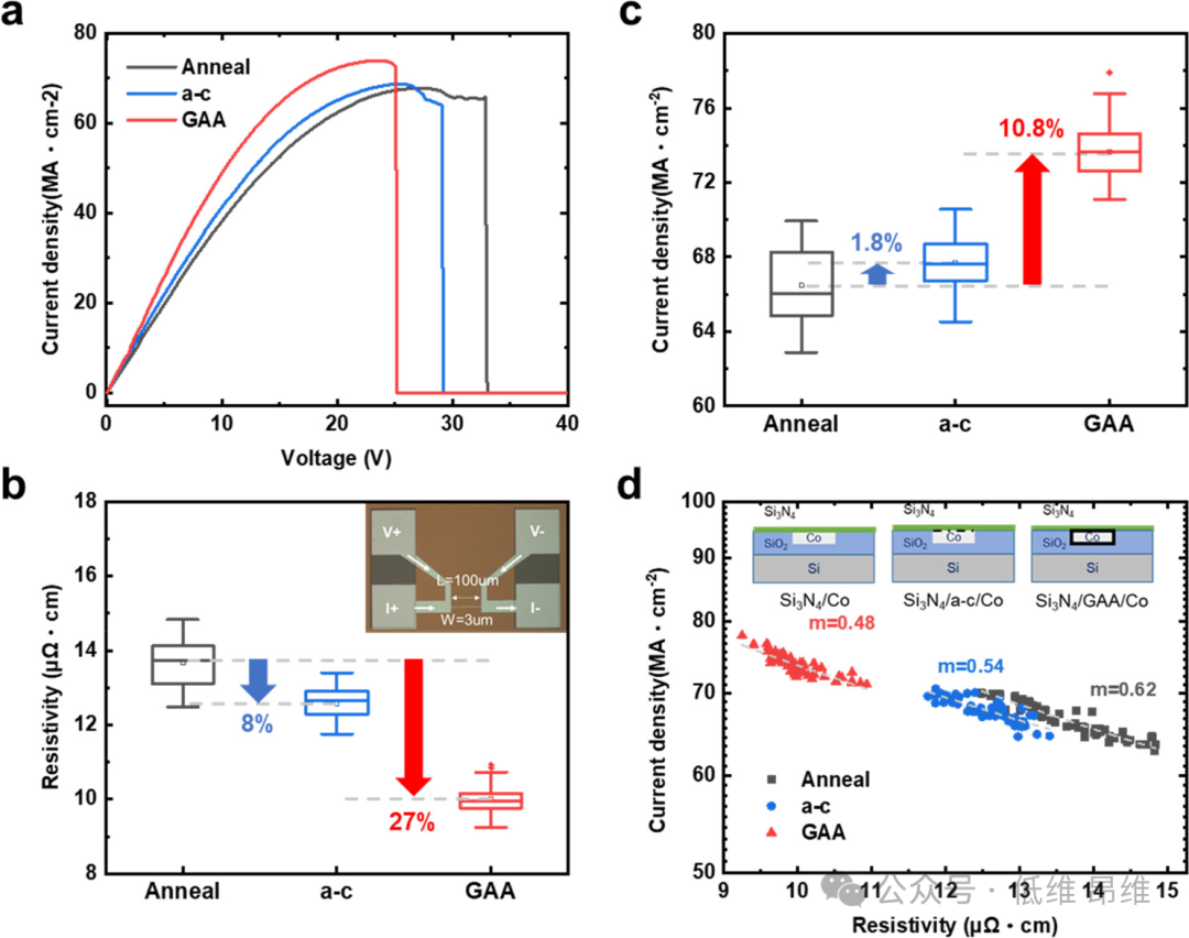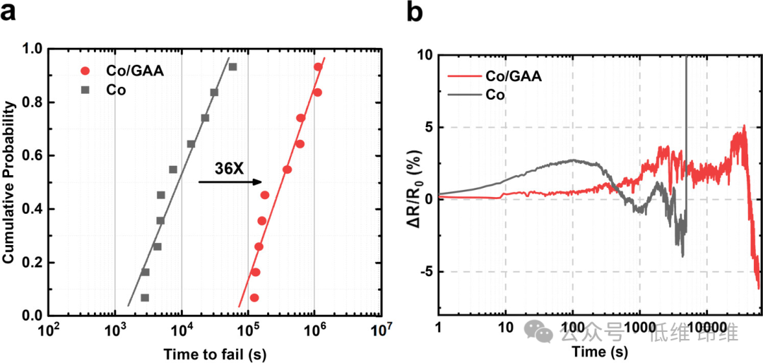 图4. (a)Si3N4/Co和Si3N4/GAA/Co的Co EM寿命统计分布。(b)在退火Co和GAA结构的EM测试中,电阻随时间的变化。